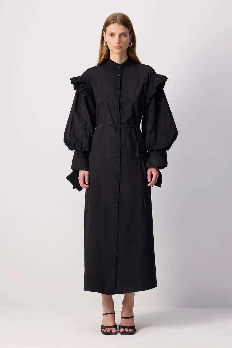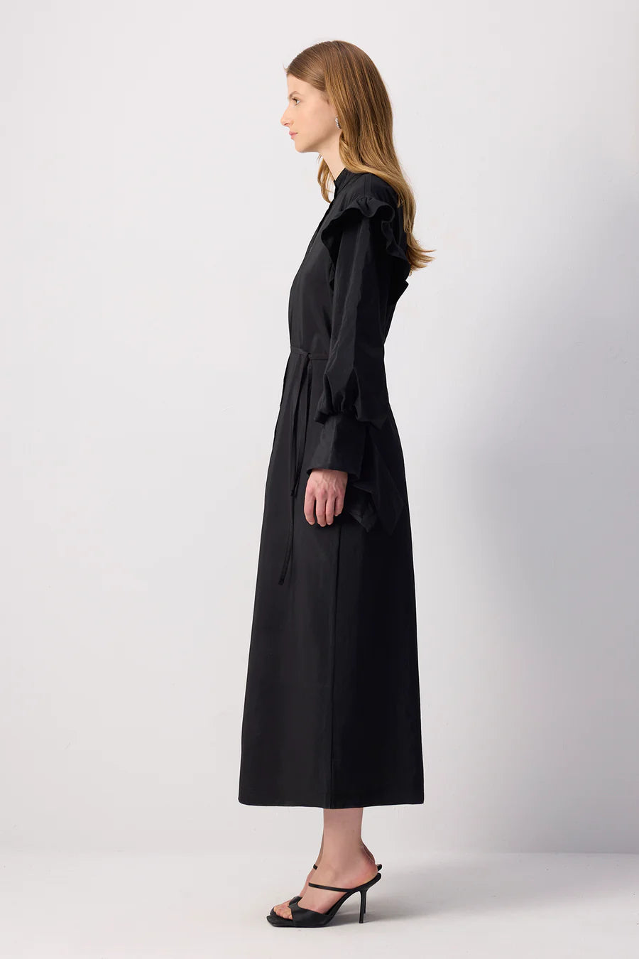 This black dress elevates simplicity with delicate ruffle accents and a refined buttoned front, offering a sophisticated yet understated look. Its subtle detailing adds texture and movement, making it a versatile piece suitable for both professional settings and elegant occasions. Crafted to balance classic style with modern flair, it ensures a polished appearance with effortless charm.